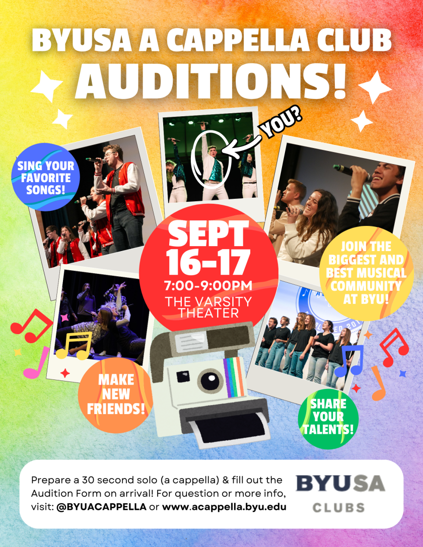 General Auditions for the A Cappella Club happen on the second Club's night of each semester from 7:00-9:00pm in the Varsity Theater WSC. There, you'll start by filling out a short form telling us about your musical experience, voice part, and other skills/interests you have related to a cappella (ie. arranging, choreographing, recording, social media etc.).